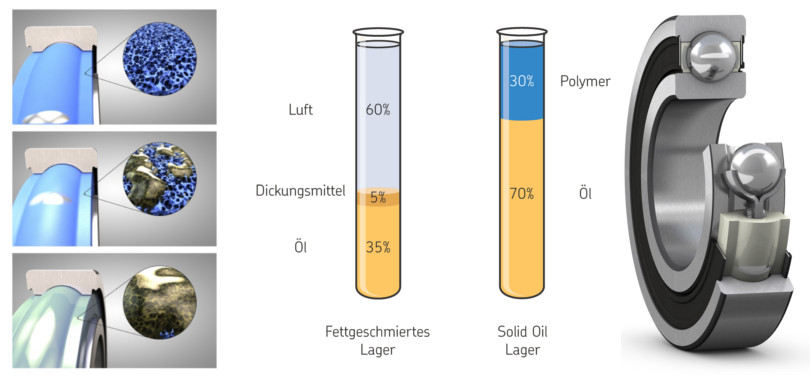 Auf der Suche nach einer Lösung wurde der Ingenieur im eigenen Hause fündig: Solid Oil („Festes Öl“). Dabei handelt es sich um eine ölgesättigte Polymermatrix, die fast den gesamten freien Raum innerhalb eines Lagers ausfüllt und etwa zwei- bis viermal mehr Öl enthält als herkömmliche fettgeschmierte Lager. Diese Technologie hatte SKF ursprünglich für Anwendungen entwickelt, in denen u. a. hohe Luftfeuchtigkeit und erhebliche Temperaturschwankungen auftreten können (im Bereich von ca. -40 °C bis etwa 60 °C).