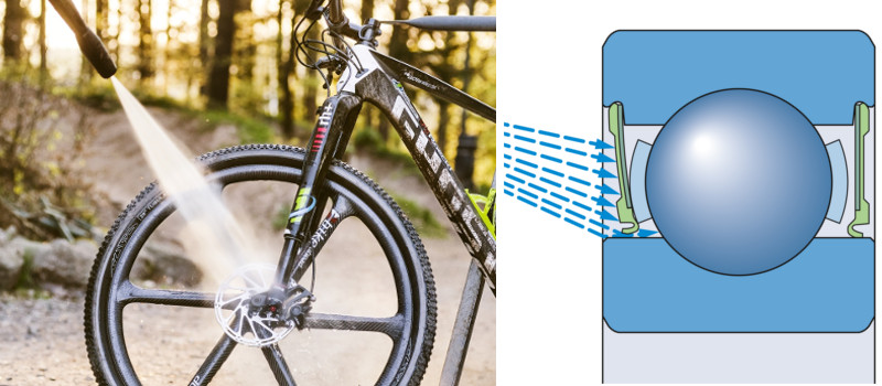 Die wesentlichen Gründe für Michaels Annahme: Die Polymermatrix schirmt die umschlossenen Lager-Komponenten viel besser gegen Verunreinigungen ab als jede konventionelle Fettschmierung. Im Zusammenspiel mit maßgeschneiderten Dichtungen versprach die Solid Oil-Technologie auch noch ein weiteres Mountainbiker-Problem zu lösen: Nach einer Fahrt durchs Gelände werden die verschmutzten Bikes oft mit mehr als 15 bar Wasserdruck abgespritzt. „Allerdings dürfen die gängigen Standard-Dichtungen maximalen Druckunterschieden von höchstens einem bar ausgesetzt werden“, wie der Anwendungsingenieur bei SKF weiß. Die Folge der Hochdruckreinigung: Wasser und weitere Fremdstoffe gelangen ins Innere, der Schmierstoff kann die Stahloberflächen im Lager nicht ausreichend schützen und es kommt zu chemischen Reaktionen. Rostnarben und Spaltkorrosion verursachen möglicherweise gefährliche Schälungen und Risse. „Aus etwa 20 Jahren Erfahrung in industriellen Anwendungen wussten wir, dass abgedichtete Solid Oil-Lager derartige Folgen weitestgehend ausschließen können“, so Benjamin Michael, „und das machte sie für den Einsatz im Mountainbike natürlich noch interessanter!“