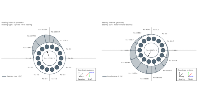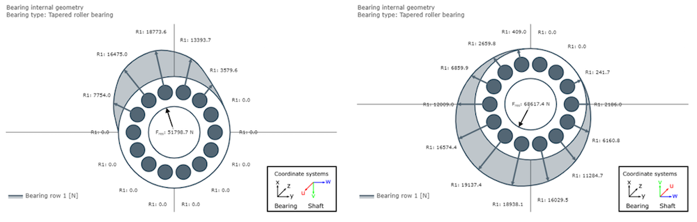 Wie zu erkennen ist, weisen beide Zylinderrollenlager der Abtriebswelle nahezu die gleiche Durchsenkung auf (Bild 2, rechts). Im Gegensatz dazu liegt an der Antriebswelle eine große Schiefstellung vor. Diese wird im Wesentlichen durch den sogenannten Einzentriereffekt am rechten Kegelrollenlager verursacht. Im linken Lager sind nur die Wälzkörper in Richtung der Radialkraft belastet (Bild 3, links). Dieses Lager senkt sich in Richtung der Radialkraft durch. Im rechten Lager ist die Rückstellkraft auf die Welle, die sich aus der Radialkraft und dem Druckwinkel ergibt, niedriger als die anliegende Axialkraft aus der Verzahnung. Dadurch wird die Welle soweit ins Lager geschoben, bis die Wälzkörper über dem gesamten Umfang anliegen (Bild 3, rechts). Die Welle senkt sich dadurch kaum in Richtung der Radialkraft durch.