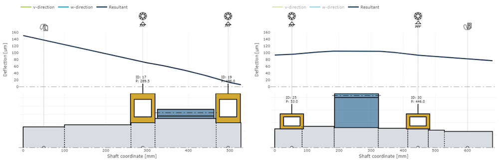 Bild 2: Darstellung von Biegelinien der Antriebswelle (zwei Kegelrollenlager 30324) und Abtriebswelle (zwei Zylinderrollenlager NJ 2230) in der FVA-Workbench