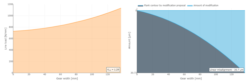 Bild 4 zeigt die, sich vor allem aus der Wellenschiefstellung der Antriebswelle ergebende, Breitenlastverteilung und den mit der FVA-Workbench ermittelten Korrekturvorschlag für eine ausgeglichene Lastverteilung.