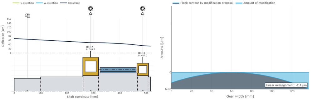 Auch hier erfolgt ein Einzentrieren der Welle am linken Pendelrollenlager, welches als Festlager die Axialkraft aufnimmt. Das vorangegangene Beispiel macht den großen Einfluss der Lagerauswahl auf die Auslegung von Verzahnungskorrekturen deutlich. Die geschilderte Einzentrierung von Wälzlagern kann bei allen Lagertypen auftreten, die keine zylindrische Lauffläche besitzen. Große Lagerspiele verstärken den Effekt. Je nach Position und Kraftrichtung können sich die resultierenden Schiefstellungen der Getriebewellen in den Zahneingriffen entweder verstärken oder kompensieren. Aufgrund der Vielzahl der sich überlagernden Einflüsse ist daher für eine praxisgerechte Korrekturauslegung eine Gesamtsystembetrachtung aller Kräfte und Verformungen im Getriebe notwendig, so wie sie die FVA-Workbench bietet. Mit der FVA-Workbench lässt sich auf diesem Weg nicht nur die Steifigkeit einer Lagerungsoption, sondern gleichzeitig auch die damit verbundene Lebensdauer und die Verlustleistung bestimmen.