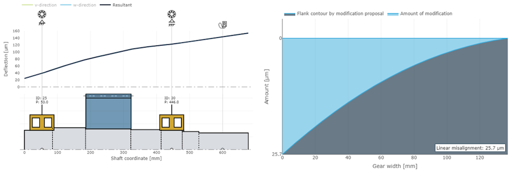 Bild 5: Darstellung von Biegelinie der Antriebswelle (Kegelrollenlager 30324 links, 30224 rechts) und Korrekturvorschlag in der FVA-Workbench