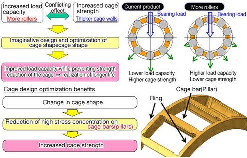 Increasing the number of rollers results in thinner cage walls, which in turn, weakens the cage. NSK countered this side effect by optimizing the cage shape to suppress stress concentration in the cage bar members, thereby achieving a sufficiently strong cage.