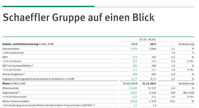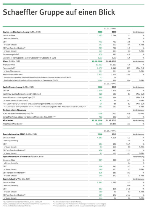 Die Netto-Finanzschulden erhöhten sich zum 30. Juni 2018 um 463 Millionen Euro, wodurch das Gearing-Ratio, also das Verhältnis von Netto-Finanzschulden zu Eigenkapital, auf rund 107 Prozent (31. Dezember 2017: 93 Prozent) anstieg. Die Schaeffler Gruppe, deren Bilanzsumme sich zum 30. Juni 2018 auf rund 12 Milliarden Euro (Vorjahr: rund 11,1 Milliarden Euro) belief, beschäftigte zum selben Stichtag 92.198 Mitarbeiterinnen und Mitarbeiter (Vorjahr: 87.937), was einem Anstieg von rund 4,8 Prozent entspricht.