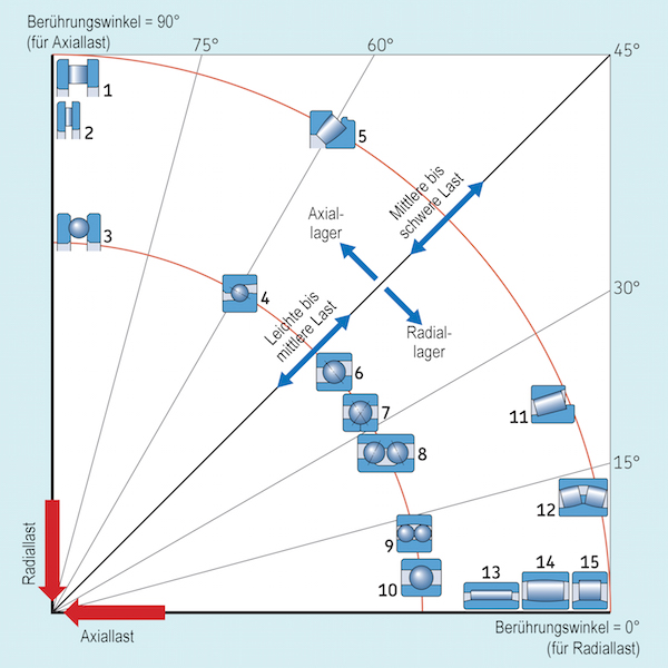 Je größer dieser Berührungswinkel ist, desto höher ist die axiale Tragfähigkeit des Wälzlagers. Im Extremfall liegt ein Berührungswinkel von 90° vor; dann handelt es sich um ein reines Axial-Lager. Schrägkugellager bewegen sich also zwischen reinen Radial- und reinen Axiallagern. Entsprechend gut können sie kombinierte Radial- und Axiallasten aufnehmen (Abb. 2).