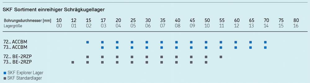 Seit kurzem bietet SKF im Bereich der einreihigen Schrägkugellager mit Messingkäfig ein erweitertes Sortiment an, das einen kleineren Berührungswinkel als die üblichen 40° aufweist: Einen Überblick über das Sortiment der neuen 25°-Schrägkugellager (Nachsetzzeichen AC) vermittelt Abb. 3.