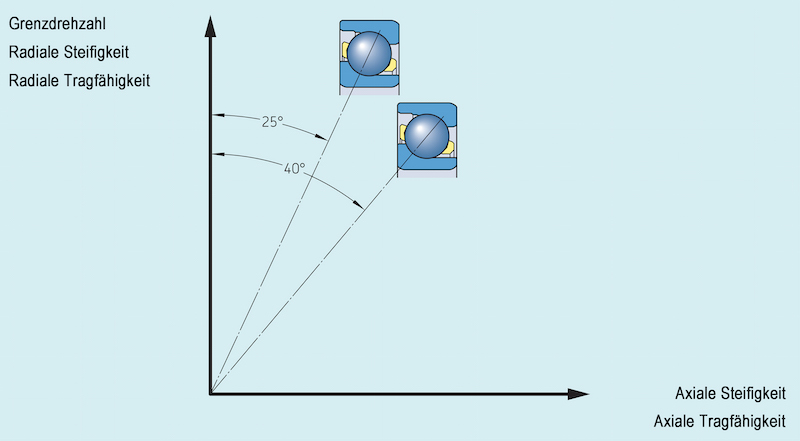 Durch den geringeren Berührungswinkel sinkt zwar die axiale Tragfähigkeit ein wenig; doch dafür ergeben sich andere Vorteile: Beispielsweise können damit unter gewissen Voraussetzungen um bis zu 20% höhere Drehzahlen erreicht werden als mit einem 40°-Berührungswinkel. Dazu tragen u. a. die günstigeren kinematischen Verhältnisse im Lager bei, die den Gleitanteil minimieren und dadurch weniger Wärme entwickeln. Außerdem sorgt der kleinere Berührungswinkel für eine höhere radiale Steifigkeit, was in überwiegend radial belasteten Anwendungen vorteilhaft ist (Abb. 4).