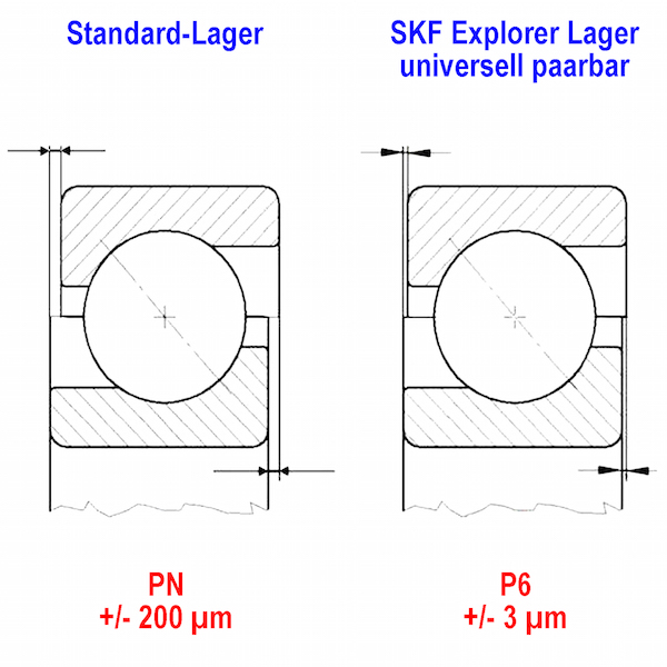 Damit die exakte Vorspannkraft / Lagerluft erreicht wird, ist eine stark eingeschränkte Toleranz der Rück- und Überstände von nur wenigen Mikrometern erforderlich (Abb. 9). Universallager vereinfachen die Montage also erheblich. Die sonst üblichen Montagemethoden sind mit einem deutlich höheren Aufwand verbunden. So kann die Vorspannung der Lager beispielsweise auch durch Anfertigung spezieller Zwischenringe im Gehäuse oder auf der Welle eingestellt werden. Dazu müssen die Lager allerdings aufwendig vermessen und für jedes Lagerpaar individuell Zwischenringe gefertigt werden (Abb. 10).
